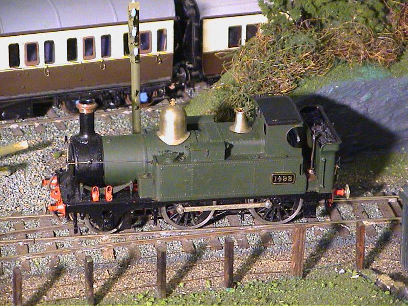 No 1498 was built at Swindon works in 1892 and withdrawn 1944. The class in general was used throughout the system on duties ranging from suburban passenger to auto trains to branch goods and passenger workings. In the 1940's, 1498 could be found on the Gloucester line hauling a B set pair carrying workers and school children (including the current modeller) to Swindon. |