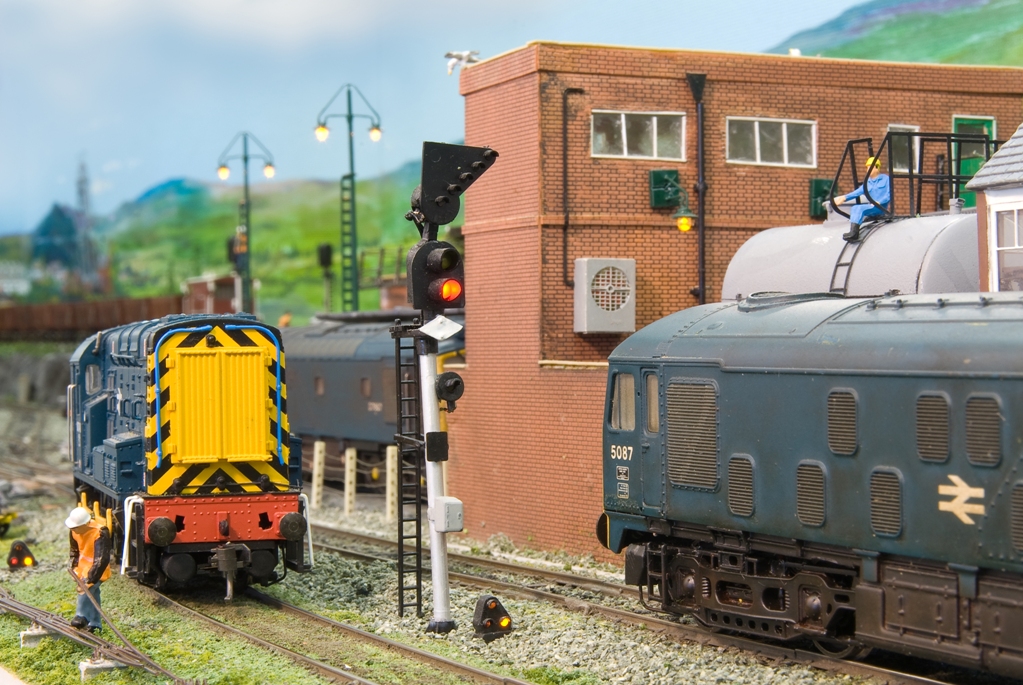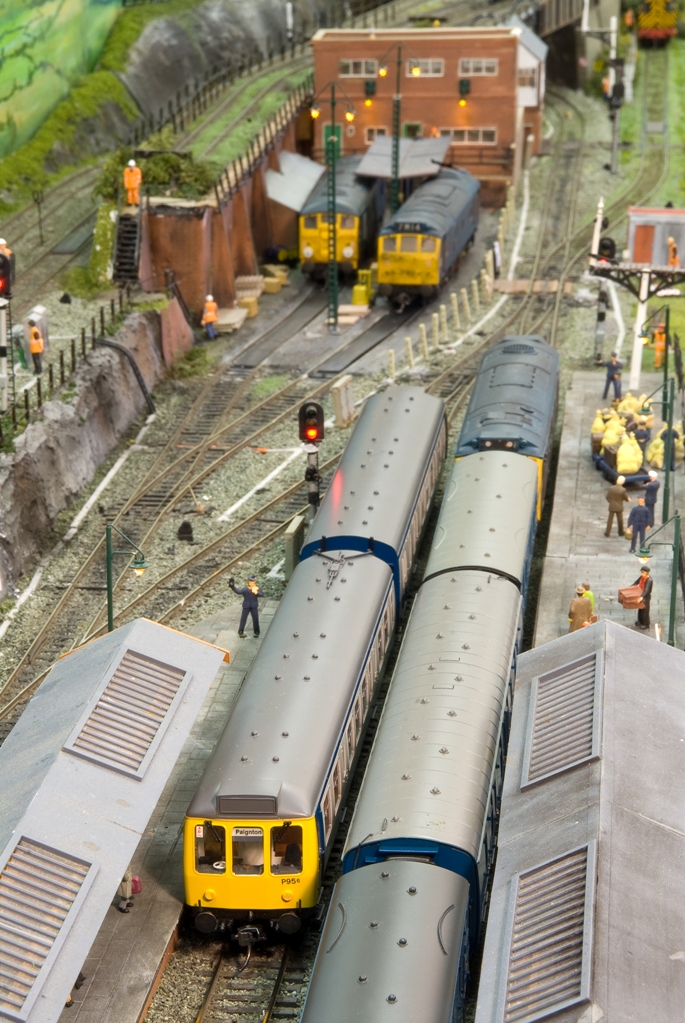 yellow light before the platform while the 08 shunter (station pilot) waits.
