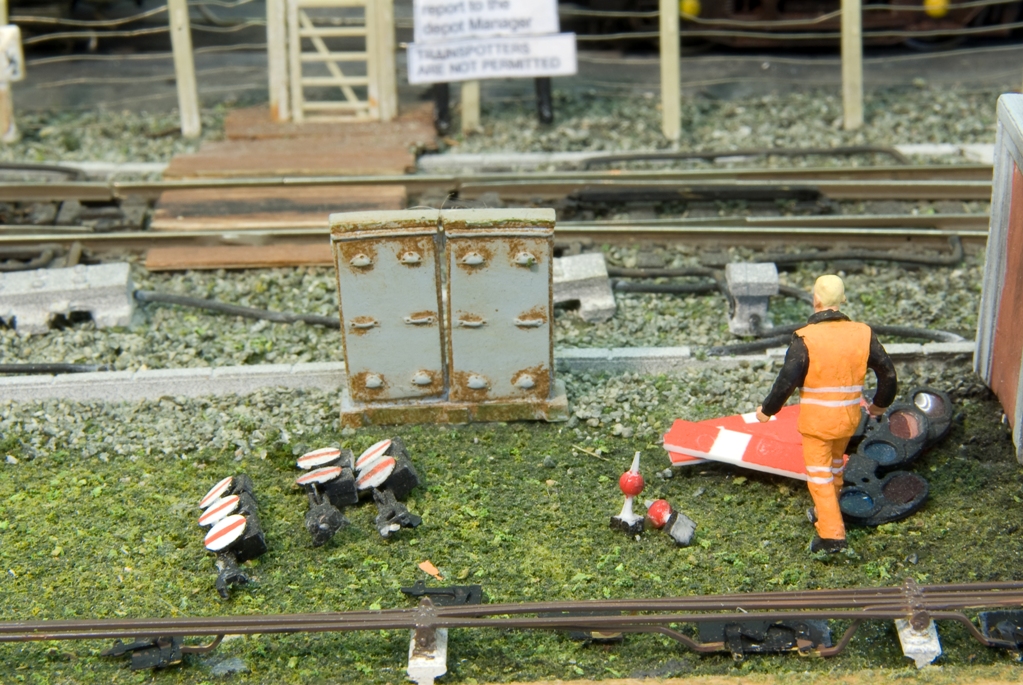 A member of S & T staff checks old semaphore signal arms which have been removed following the recent upgrading to colour light signals.