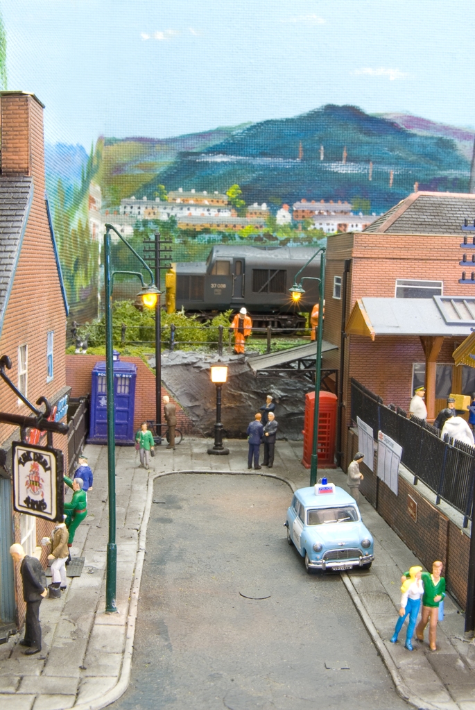 The main passenger entrance to the station, with a class 37 on the freight recetion siding above. Note the 'Tardis' at the end of the road |