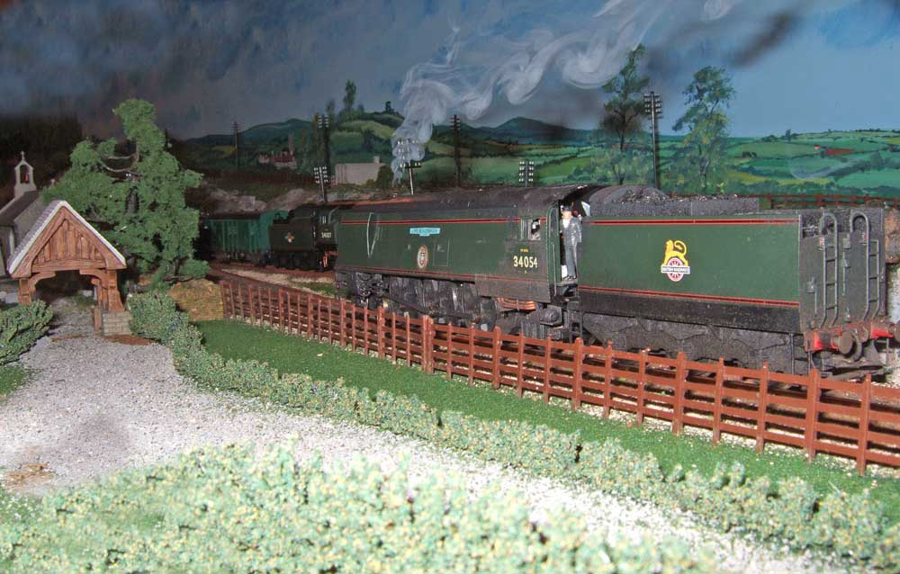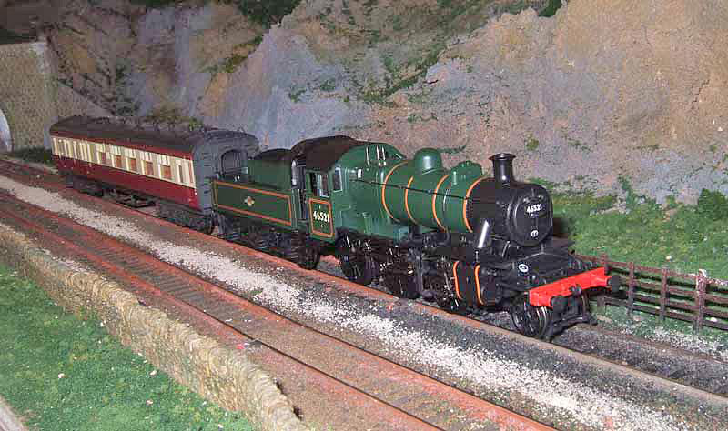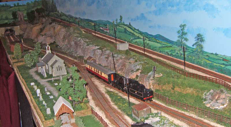 Details (for exhibition managers) are, 00 gauge (4mm = 1 foot), 2 x 18 ft scenic + 4 ft Fiddle yard, operated from the front. 2 operators needed, though 1 can manage. Operated with DCC.