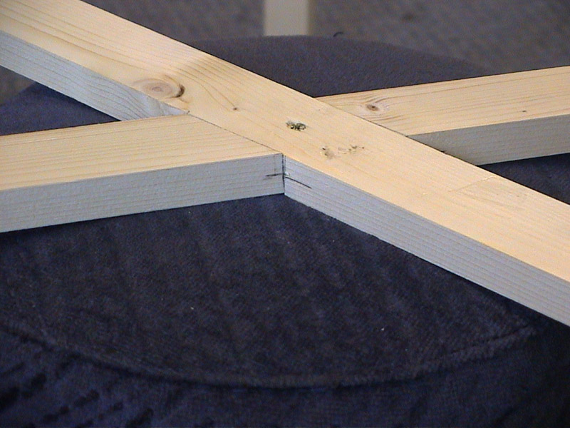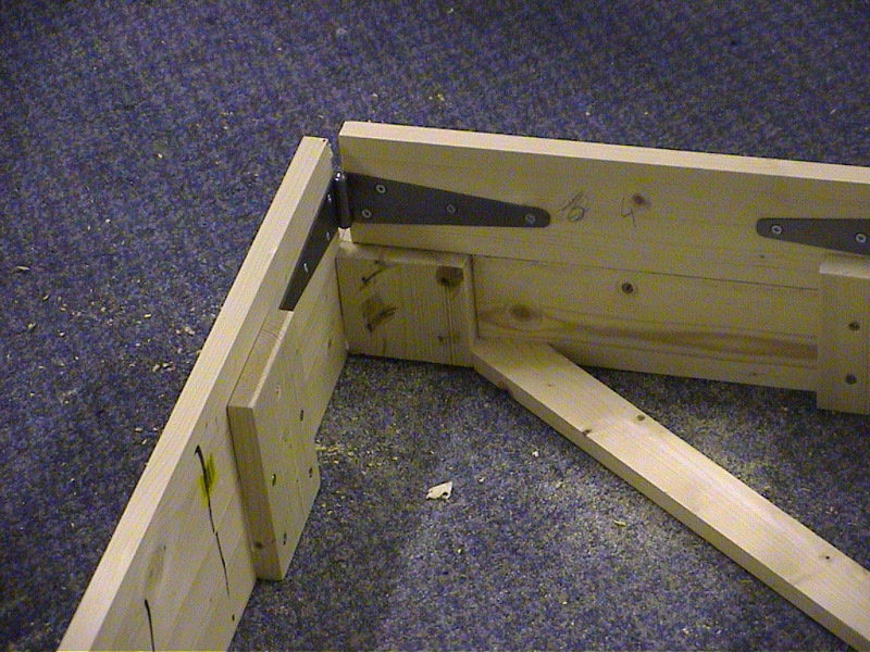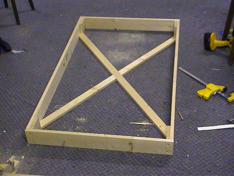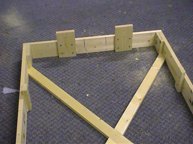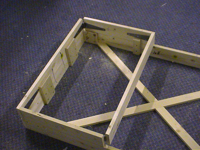 Take four 4 foot lengths of 4 by 1 inch timber and four 2 foot 6 lenghts of 4 by 1 inch and screw together to make two open frames. Use four inch offcuts to strengthen the corners. |