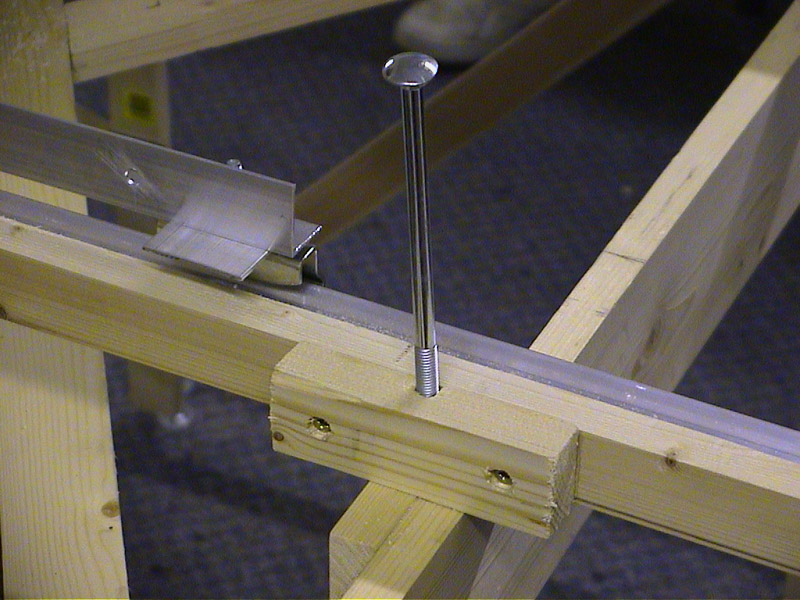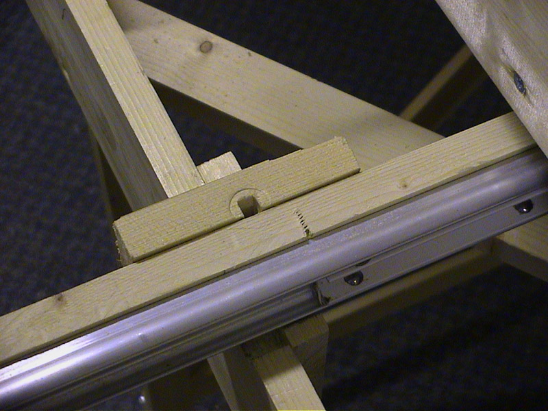 | Two pieces of scrap timber are routered to give a channel 8 mm wide and deep. One is fixed to the wooden cross member under the aluminium siding rail, the other to the side of the main frame of the traverser. A small channel is cut in the main frame sides to allow the cross member to line up easily.