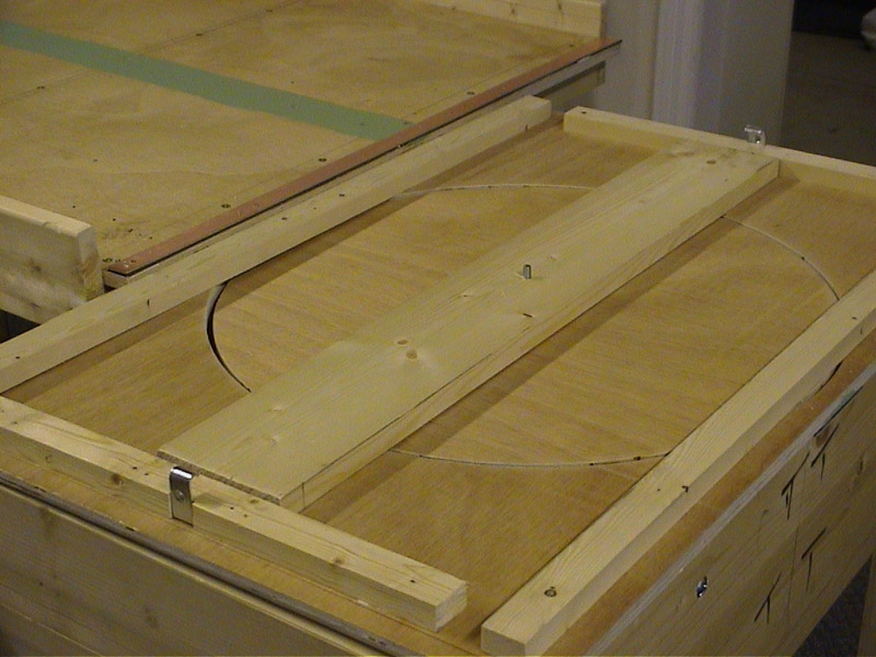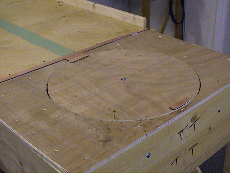 We now turn our attention to the tops of the two end pieces of the traverser (see weeks 2 & 3). A circular piece 18 inches diameter is removed from one top to form a turntable. |