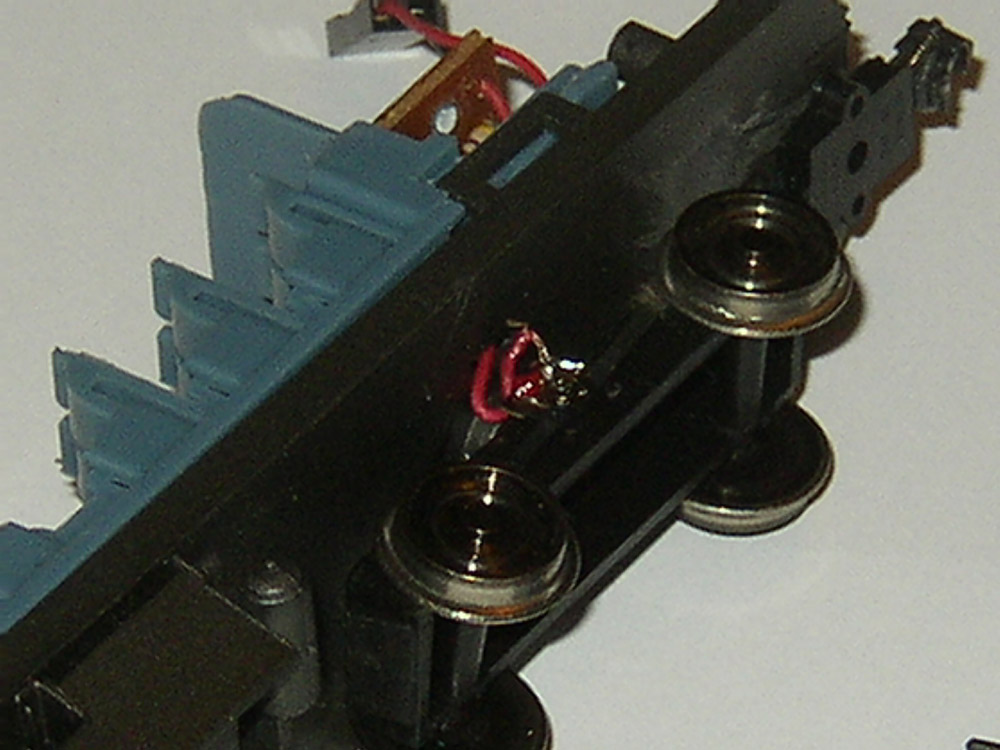 Gently feed the wires through the holes in the chassis and solder to the side connections of the bogie.